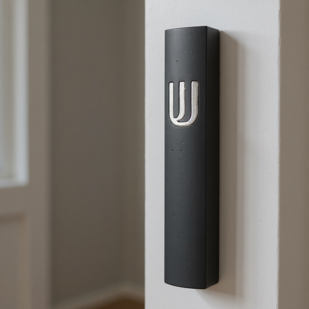 מזוזת בטון בצבע אפור כהה עם כיתוב ש' מכסף – 15 ס"מ. חזקה, עמידה ומרשימה. משתלבת עם קירות בהירים וכהים כאחד.
